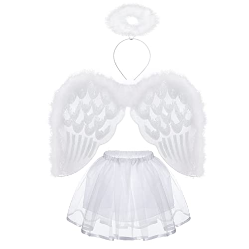 Ängeldräkter för flickor, tutukjol, vita fjädrar ängelvingar och Halo-ängelvingar, Fairy-kostym för barn