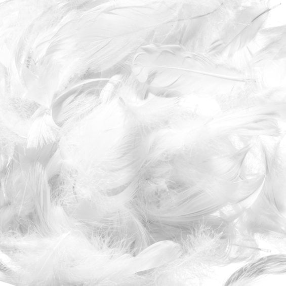 Cirka 70 vita fjädrar, längd 5–10 cm