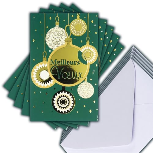 M5-511 LOT 5 identiska kort bästa gyllene önskningar i guld 13,5 x 8,5 cm + 5 vita kuvert 14 x 9 cm - Gott nytt år önskar januari geometriska julgranskulor - skapade tryckta i Frankrike