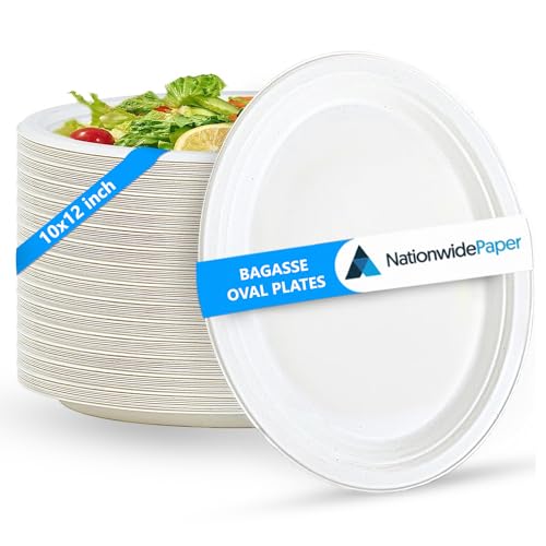 NationwidePaper 25 x 30 cm engångs ovala papperstallrikar, stora, slitstarka, miljövänliga, vita bagasse-pappersplattor, 100 st