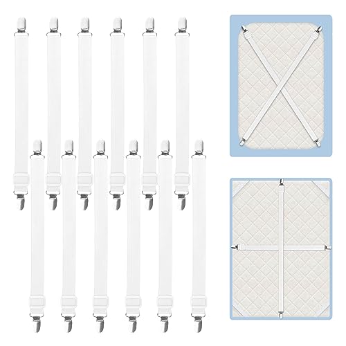 Rickwayy 12 stycken lakanspännare, 35–120 cm sänglakan spännare, justerbar vit lakan spännband med metallklämma, för lakan, madrass, strykbräda eller soffa