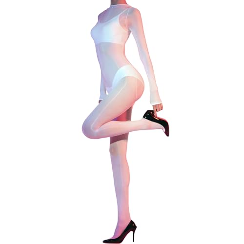 RUIBAVYA Bodystocking Dam Glansiga Strumpbyxor Olja Långa Ärmar Pantyhose Full Body Catsuit Nylon Shiny Strumpbyxor, Vit, M