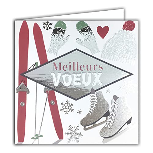 Fyrkantigt kort gott nytt år bästa önskningar silver glänsande med vitt kuvert vintersport skidor skridskoåkning vantar mössa tofsar hjärta avslutningsfester 23044