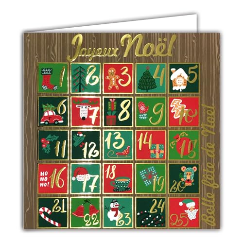 God jul kort i glänsande guld guld med vitt kuvert 15 x 15 cm - adventskalender 25 december fest slutet av året gåvor dekorera gran, kakor väntar jultomten - tillverkad i Frankrike