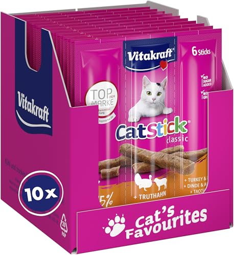 Vitakraft Cat Stick Classic, kattmellanmål, köttiga minipinnar, med kalkon och lamm, i lagerstorlek, utan tillsats av socker och spannmål (10 x 36 g)