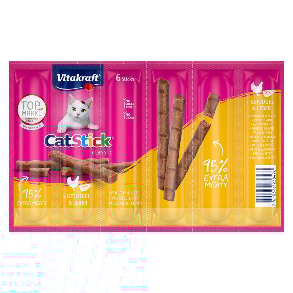 Vitakraft Cat Stick Classic, kattsnacks, köttiga minipinnar, med fjäderfä och lever, i lagringsstorlek, utan tillsats av socker och spannmål (10 x 36 g)