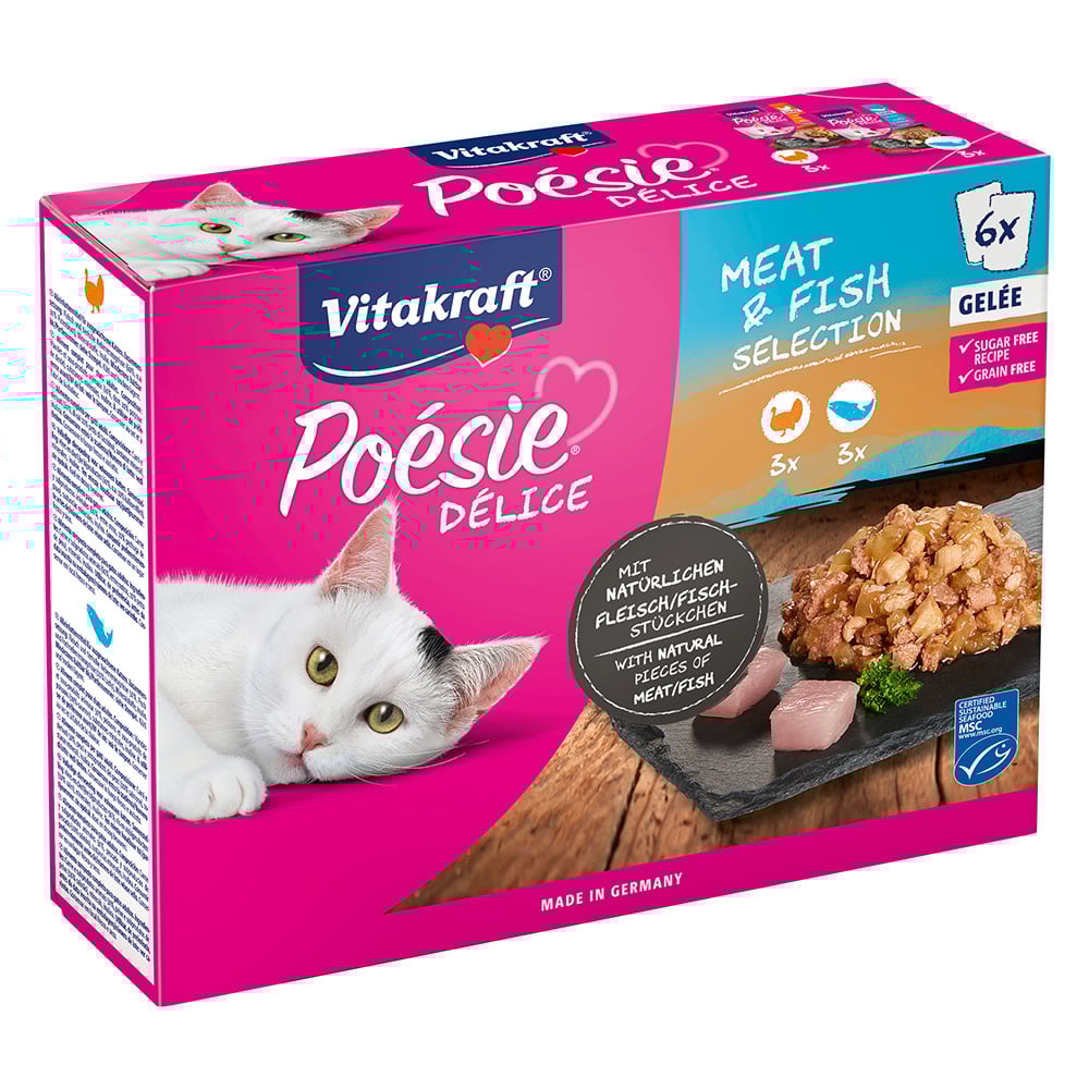 Vitakraft Poésie Délice, Meat and Fish Selection, våtfoder i multipack, i utsökt gelé, med kalkonbröst, med lax, för vuxna katter (6 x 85 g)