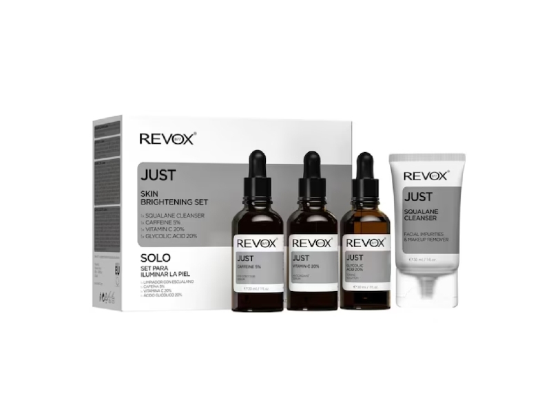 Skin Brightening Set Revox B77: Just, Caffeine 5%, Anti-Dark Circles, Day, Eye Serum, 30 Ml + Just, Vitamin C 2%, Anti-Oxidant, Serum, For Face, 30 Ml + Just, Glycolic Acid 20%, Toning, Serum, For Face, 30 Ml + Just, Squalane, Eliminates Impurities,