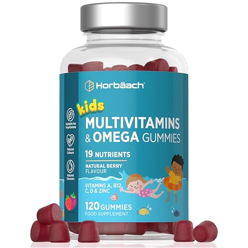 Multivitamin Barn Gummies med Omega 3 6 9 | 120 Veganska Gummibjörnar for Kids | 19 Essentiella Näringsämnen med Vitamin A, B12, C, D och Zink | Kids Multivitamin Supplement | av Horbaach