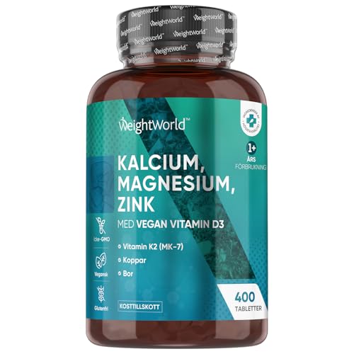 Kalcium Magnesium Zink - 400 tabletter 1+ år - Magnesium, Vitamin D3 K2, Bor, Selen, Koppar - 500 mg Kalcium - 1 vegansk tablett per dag - Glutenfri - Alternativ till elektrolytkapseler - WeightWorld
