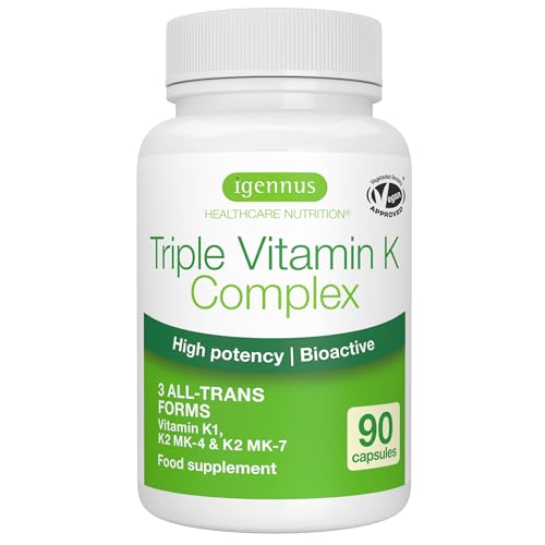 Igennus Advanced Triple Vitamin K Complex 2700 mcg, Vitamin K1 & K2 (MK-4 & MK-7), Bioaktiva Naturliga Former, Högeffektiv, Skelett- & Hjärt-kärlhälsa, Clean Label, Vegansk, 90 Kapslar