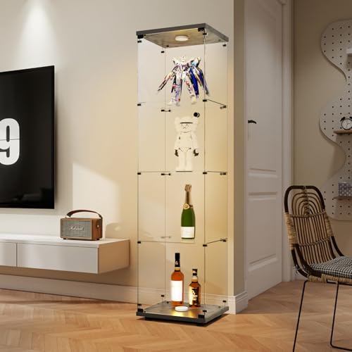 BLSYHDH glasvitrin stående vitrinskåp, skåp för samling med LED, med 1 dörr 4 hyllor transparent möbler vitrin glas vitrin figur glasvitrin vardagsrum bar (4 våningar, 1 dörr + LED, svart)