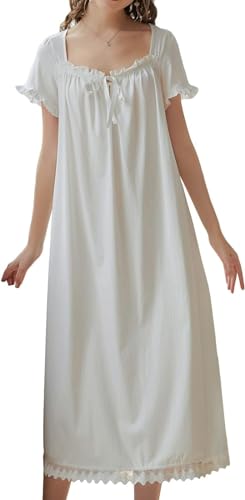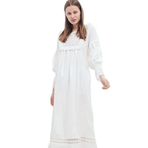 LLECDASEUI För kvinnor viktoriansk bomull nattlinnen vintage sovskjortor spets volang prinsessa nattlinne, Vitt, M