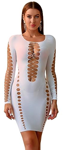 Bommi Fairy Dam nätutskärningar underkläder bodycon sexig fisknät outfit långärmad kroppsstrumpa i ett stycke festklänning babydoll nattlinne, Vit, XS-XXL