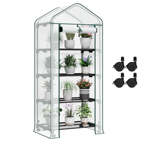 WOLTU Växthus med hjul, folieväxthus med 4 hyllor, halvtransparent tomatväxthus med rullbar dörr, vinterskydd för växter, för balkong terrass trädgård, 70 x 50 x 162 cm, vitt