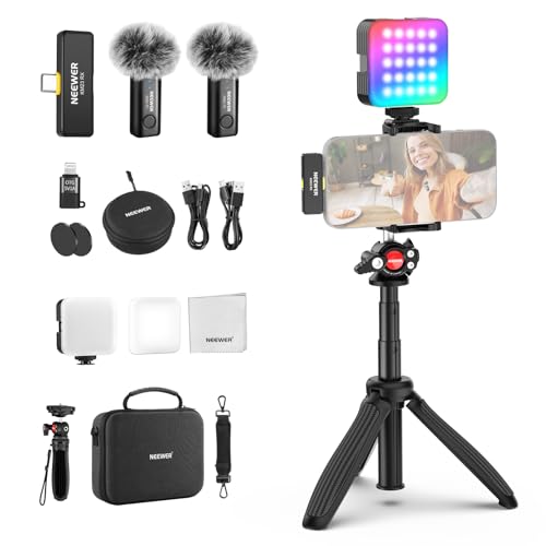 NEEWER PA048 Vlogging-set kompatibelt med iPhone Android Podcast YouTube med RGB LED-ljus/KM23 trådlöst mikrofonsystem/selfie-stick telefonstativ/rengöringsduk, innehållsskapare viktig
