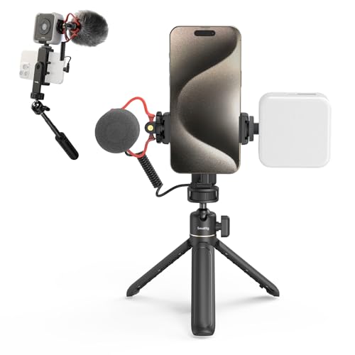 SMALLRIG VK-50 Vlogging-kit, vikbart telefonstativ, videoinspelningsutrustning, med telefonstativ och telefonmonteringsljus och hagelgevärsmikrofon, bärbar vlogpinne för iPhone för Samsung etc.-4369