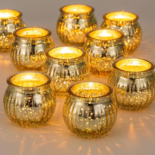 NUPTIO Glasvärmeljushållare Guld - 12 stycken Små Pumpa Jul Mercury Värmeljushållare Set Ribbade Votivljus Bröllopsfest Vardagsrum Bord Centerpieces Halloween Ornament