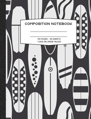B/W Surfboard Composition Notebook: Black and White Surfboards on the cover/ Wide-Ruled/7.4x9.7in/110 pages-55 sheets