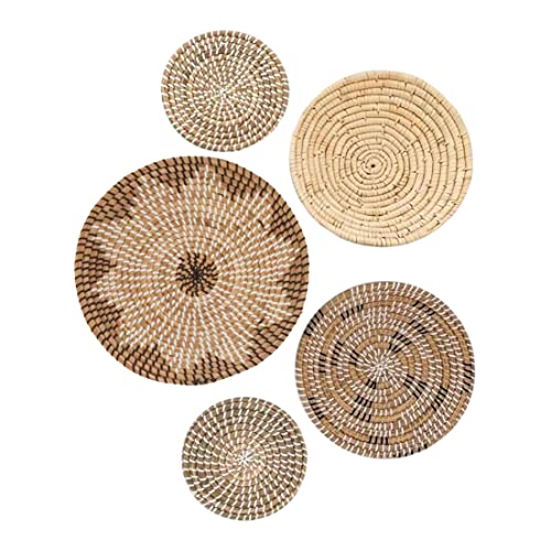 NIDONE Boho Wall Basket Decor, uppsättning av 5, runda sjögräsvävda korgar, geometrisk design Bohemian hängande dekorationer för vardagsrum, kontor, sovrumsväggar