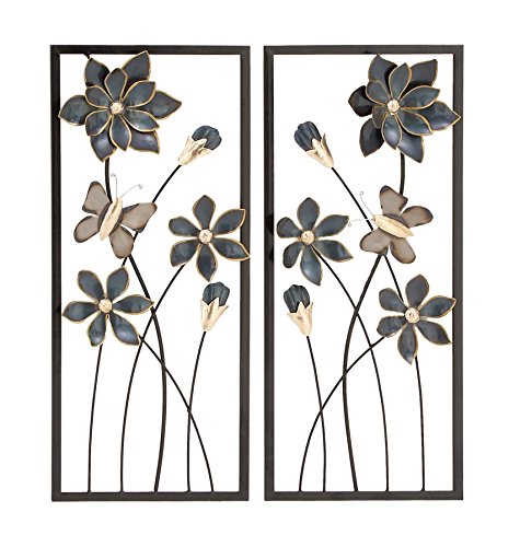Deco 79 Metal Floral Home Wall Decor Wall Sculpture with Black Frames and Butterfly Accents, Set of 2 Wall Art 12"W, 28"H, Teal
