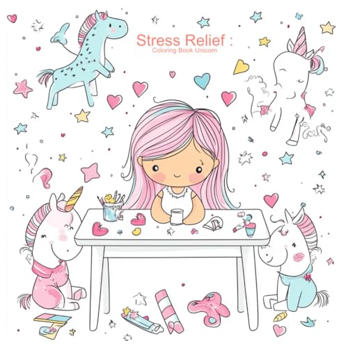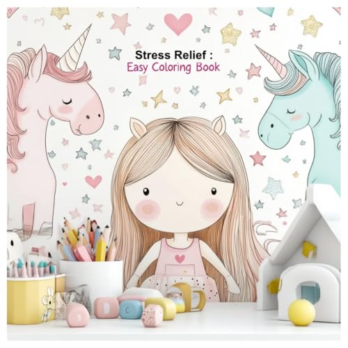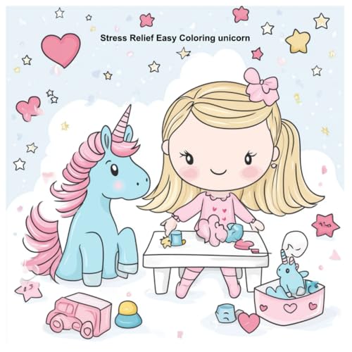 Stress Relief Easy Coloring Book: unicorn Cartoon-style, cute girl in pastel pink colors, children's wallpaper with small hearts and stars in the ... room decor, wall mural design, white table