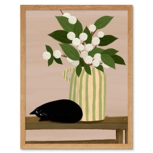 Wee Blue Coo Sleepy Black Cat with Olive Green Vase White Berries Art Print Framed Poster Wall Decor 12x16 inch