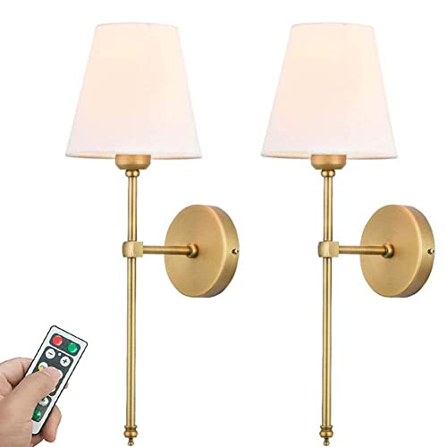 QIByING 2PCS Battery Operated Wall Light Black Fabric Candle Sconces Wall Decor Set Of 2 Gold Battery Powered Wall Lamp With Remote Dimmable LED Rustic Wall Sconces For Bedroom Lounge Farmhouse