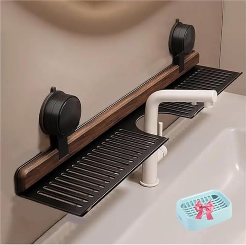 Walnut Suction Cup Bathroom Shelf, Wall Mounted No Drilling Wooden Storage Shelf Basket, Removable Shower Suction Shelfs, Wood Faucet Storage Rack with Soap Box(Black)