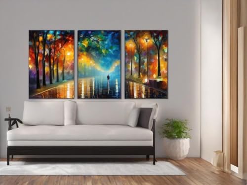 Leonid Afremov Style Rainy Summer Night - 3x A1 Poster - Triptych rolled in tubes BensArt Triptych set 3 Three Stretched Mounted Multi Panel Wall Art Classic Picture Arts Abstract Artwork Painting Pr