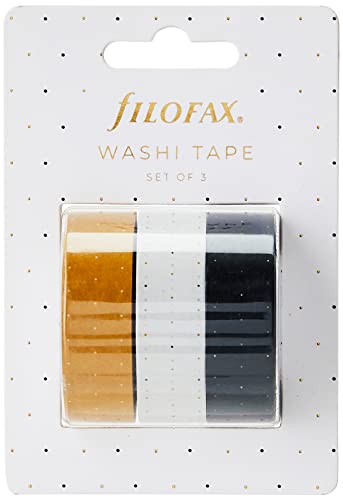 Rayher 60969000 Washi Tape Set, 3 rullar à 10 m, 15 mm bred, 3 mönster i svart/guld/silver, pappersfolie, papperstejp, tejp, dekortejp