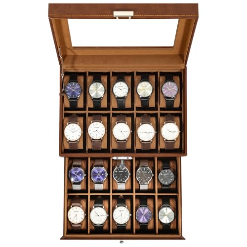 Uten Watch Box 20 spår, 2-nivås klockfodral med nyckellås, glaslock, klockdisplay förvaringslåda för män och kvinnor, brunt syntetiskt läder, brunt sammetsfoder, avtagbara kuddar, presentidé