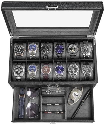 Uten Watch Box 12 fack, klockfodral med glaslock, klockdisplay förvaringslåda för män och kvinnor, avtagbara klockkuddar, metalllås, svart syntetiskt läder, svart sammetsfoder, presentidé