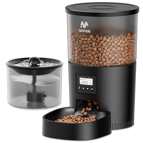 IMIPAW Automatic Cat Feeder and Water Dispenser, Programmable Dry Food Dispenser for Cats, 1–6 Meals per Day, Pet Water Fountain with Filter for Small Pets (Black)
