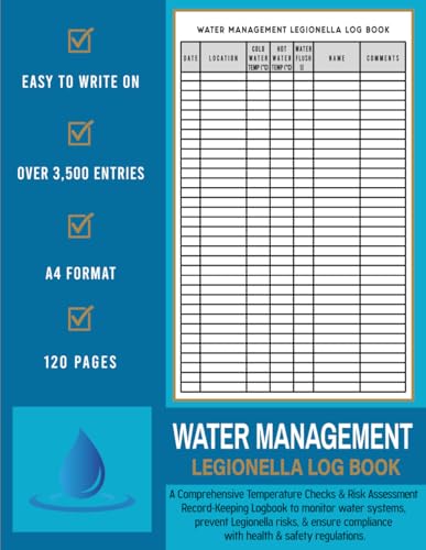 Water Management Legionella Log Book: Temperature Checks and Risk Assessment record keeping logbook to monitor water systems & prevent Legionella risks.