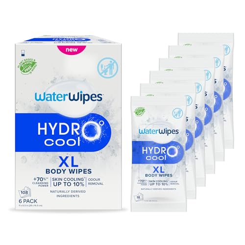 WaterWipes HydroCool kylande våtservetter, XL kroppsrengöring, omedelbart svalkande känsla, tar bort svett och lukt. Perfekt för gym, resor och utomhusbruk, 108 stycken (6 förpackning)