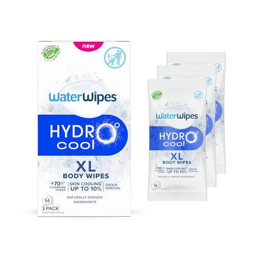 WaterWipes HydroCool kylande våtservetter, XL kroppsrengöring, omedelbart svalkande känsla, tar bort svett och lukt. Perfekt för gym, resor och utomhusbruk, 54 stycken (3 förpackning)