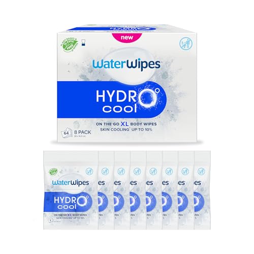WaterWipes HydroCool kylande våtservetter, XL kroppsrengöring, omedelbart svalkande känsla, tar bort svett och lukt. Perfekt för gym, resor och utomhusbruk, 64 stycken (8 förpackning)
