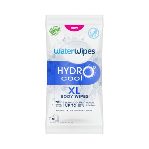 WaterWipes HydroCool kylande våtservetter, XL kroppsrengöring, omedelbart svalkande känsla, tar bort svett och lukt. Perfekt för gym, resor och utomhusbruk, 18 stycken (1 förpackning)