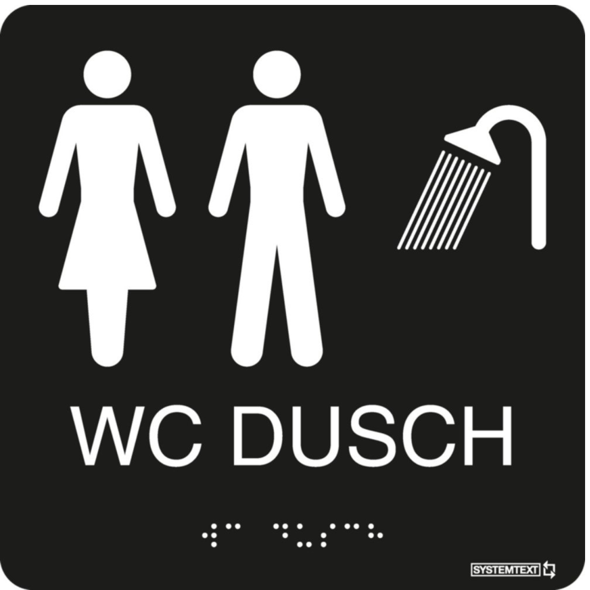 Taktil skylt "WC/Dusch Dam/Herr" Svart