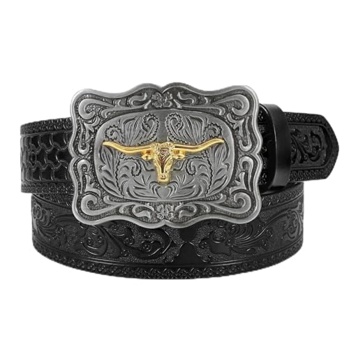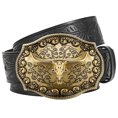 JasGood Western läder cowboy bälte för män kvinnor långhorn spänne cowgirl bälte blommig graverad präglad vintage unisex bälte för jeans, svart, 120cm: Fit Taille Größe 97cm-106cm