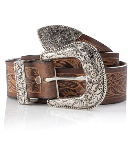 Angus Stoke Westernbälte av buffelläder – kvinnor och män vintage cowboy western & rodeo bälte – original handsnidat läderbälte Jessy, BRUN, Bundweite 90 (46-48)