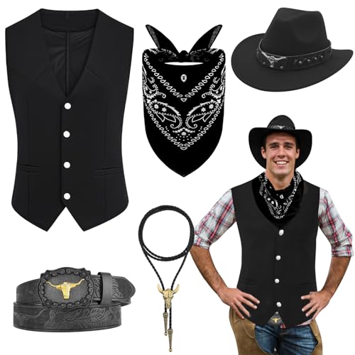 Saier tbo 5-delad cowboy-kostymtillbehör för män, Western Cowboy, Fancy Dress Set med hatt, väst, bandana, bolo spänne, bälteshalsband för karneval, cosplay fantasi (svart, M)