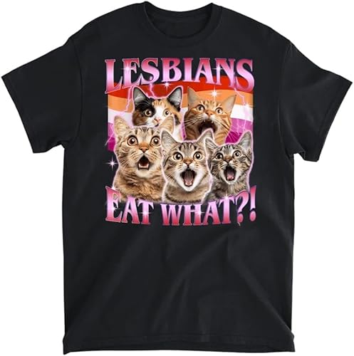OrcoW Lesbians Eat What Funny Offensiv olämplig katt meme T-shirt för män kvinnor svart, Svart, 3XL