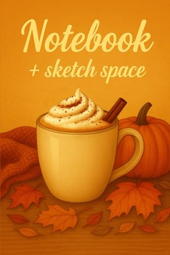 Notebook + Sketch Space – 241 pages: Hot drink in a cream-colored cup, topped with whipped cream and cinnamon, surrounded by autumn leaves