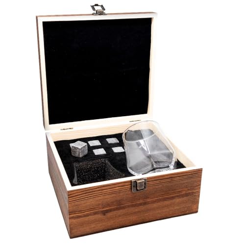 VB VIN BOUQUET Fia 1366 trälåda whiskey set, 6 stenkyl kuber + 2 eleganta sexkantiga glaskoppar, perfekt som present