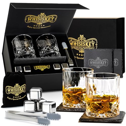 WHISISKEY - Whiskyglas Set - Whisky Gåvoset - Whiskeyglas - Present till Män - Presentidéer för Män - Födelsedagspresent Man - Presentlåda, 2 Whiskyglas 310ML, 4 Whiskystenar, Tillbehör