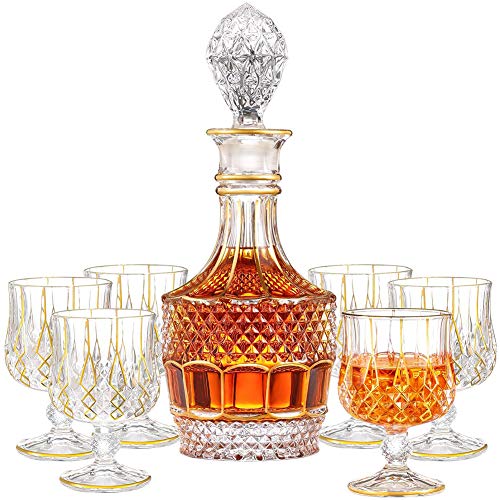 Whisky Karaff Set med 6 glas koppar, Glas Vinflaska Guld Trim Whisky Karaff, Premium kvalitet Crystal Karaff Set för sprit Scotch Bourbon