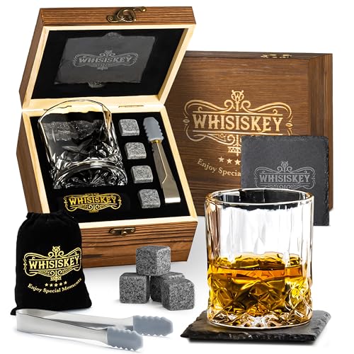 WHISISKEY - Whiskyglas Set - Whisky Gåvoset - Whiskeyglas - Present till Män - Presentidéer för Män - Födelsedagspresent Man - Presentlåda, 1 Whiskyglas 310ML, 4 Whiskystenar, Tillbehör