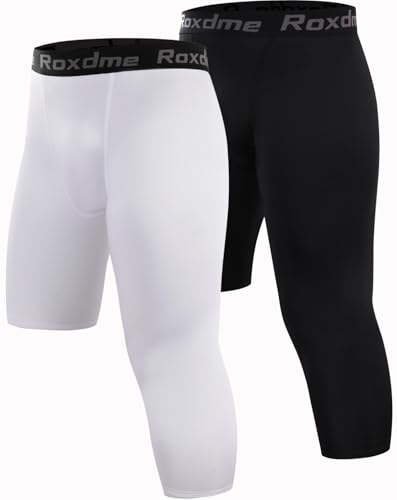Roxdme 2-pack herr 3/4 one leg kompression capri tights byxor basket atletisk löpning, Svart+vit (höger kort), S